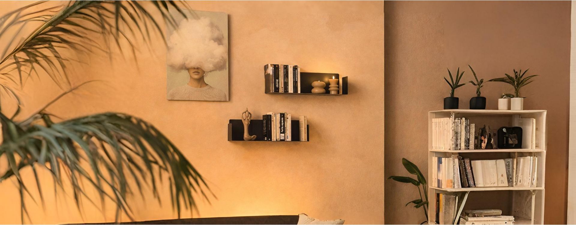 Le blanc sert souvent de point de départ, surtout lorsque l’on souhaite ajouter du rangement sans transformer l’ambiance. Sur un mur clair, l’étagère se fond, laissant les objets faire le travail. Cette discrétion permet d’organiser l’espace sans alourdir la lecture du mur.